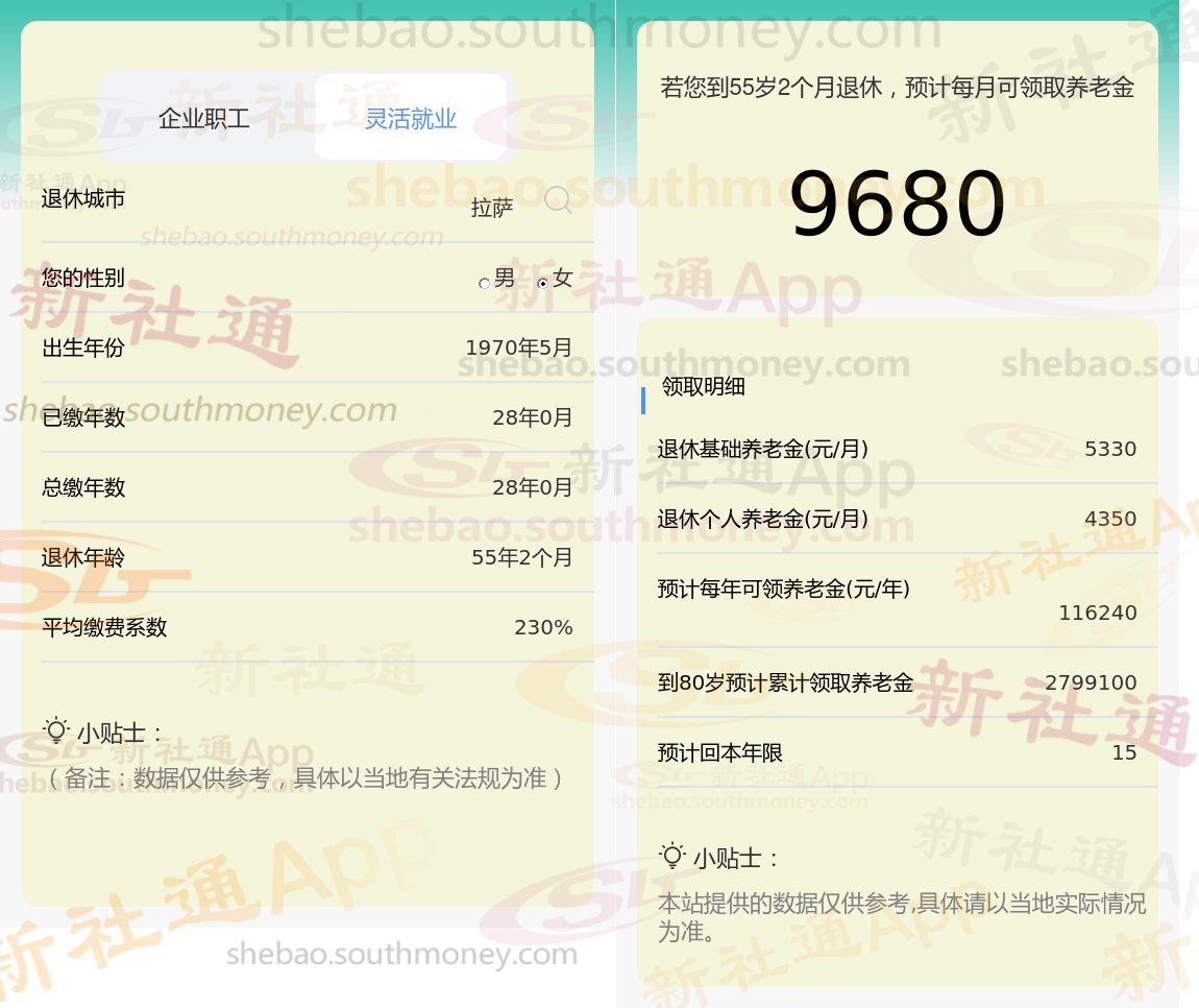 拉萨28年基础退休金:基本养老金=(退休时上年度全市城镇单位就业人员月平均工资+本人指数化月平均缴费工资)÷2×缴费年限×1%。每月大约5330元。