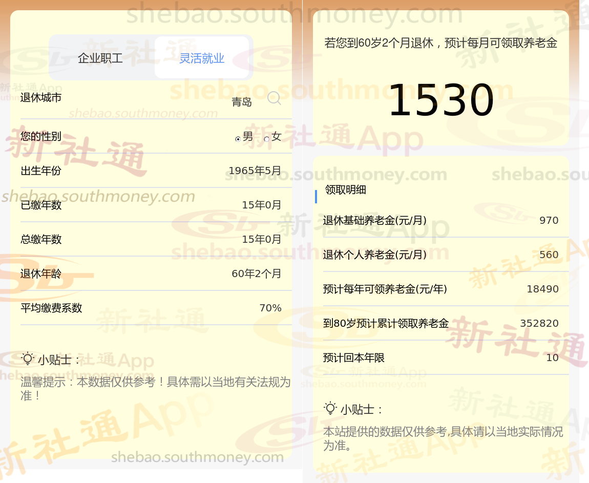 退休城市:青岛,性别:男,出生年份:1965,总缴年数15年,缴费档次:70%,新社通app养老金计算器所得: