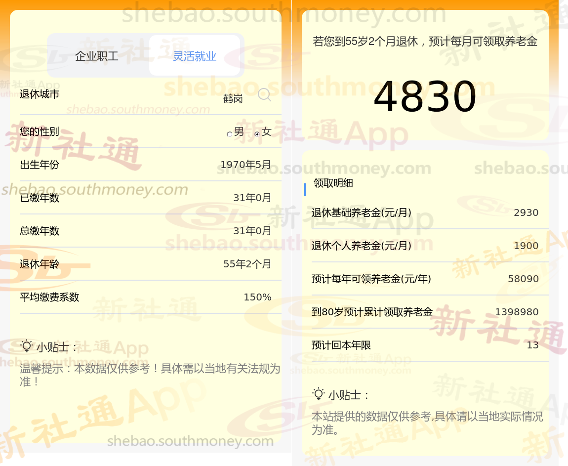 退休城市:鹤岗,性别:女,出生年份:1970,总缴年数31年,缴费档次:150%,新社通app养老金计算器所得: