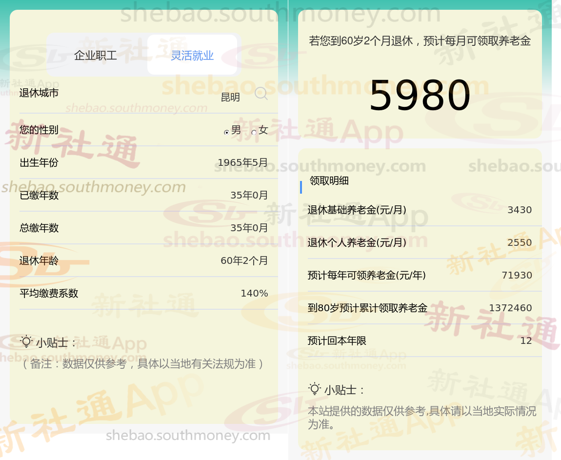 林某,作为一位勤勉的职工,他的养老保险缴纳记录长达35年之久,且缴费档次一直保持在较高的140%水平。基于这些关键数据,我们利用新社通app养老金计算器,结合最新的养老保险法规,对其养老金进行了如下估算: