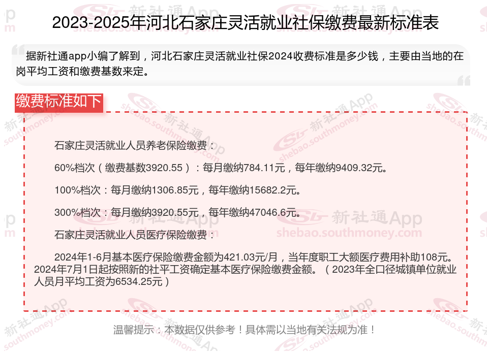 据新社通app数据显示,河北石家庄灵活就业人员养老保险缴费基数2024-2025年最新标准如下: