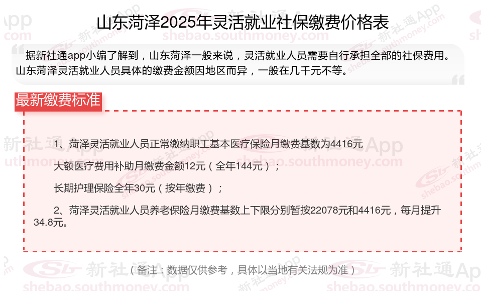 2、菏泽灵活就业人员养老保险月缴费基数上下限分别暂按22078元和4416元,每月提升34.8元。