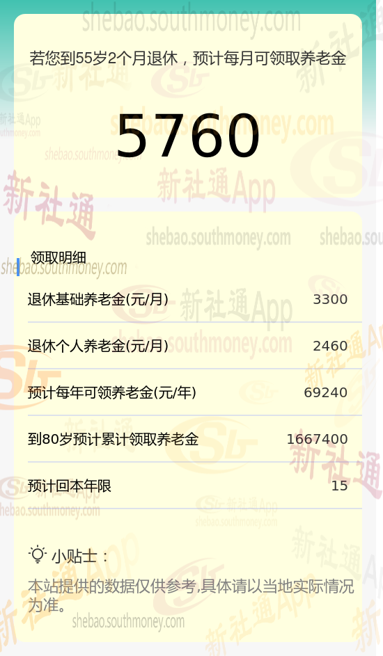 因此,沈某预计每月可领取的养老金总额为基础养老金与个人养老金之和,即3300元 +2460元 = 5760元。这一估算结果由新社通app养老金计算器提供。