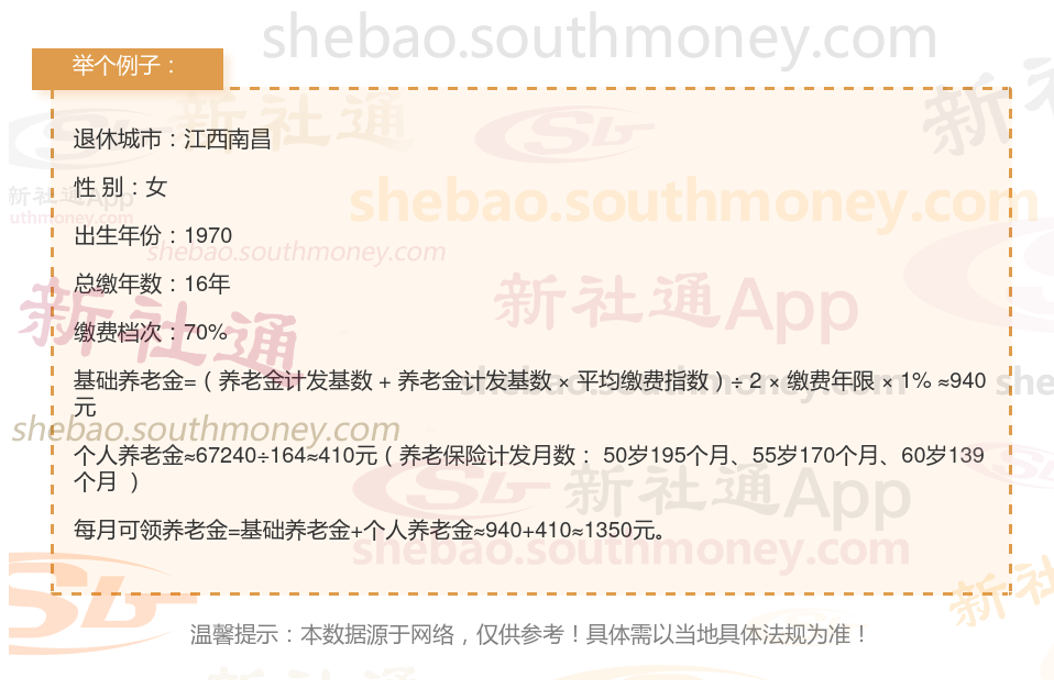 退休城市:江西南昌,性别:女,出生年份:1970,总缴年数16年,缴费档次:70%