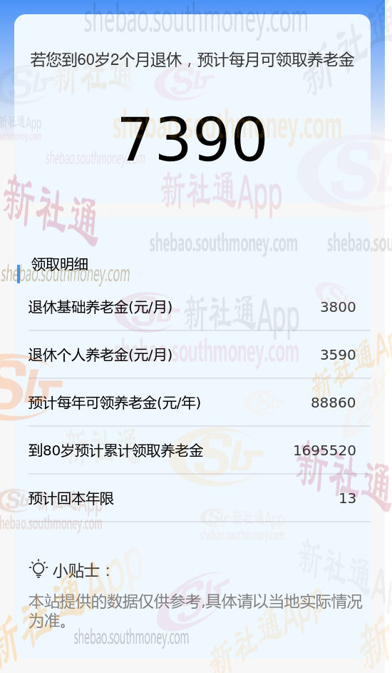 每月可领养老金总额:将基础养老金与个人养老金相加,每月可领取的养老金总额约为7390元(3800元+3590元)。