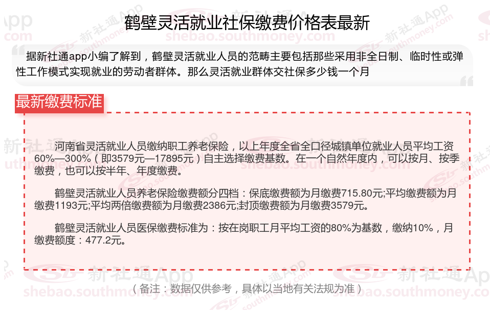 据新社通app数据显示,鹤壁企业灵活就业养老保险的缴费基数为:3579元。