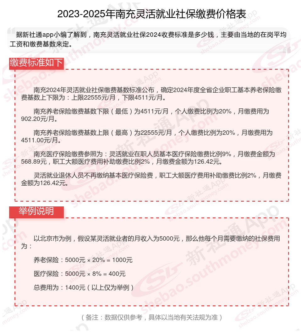 南充2024年灵活就业社保缴费基数标准公布,确定2024年度全省企业职工基本养老保险缴费基数上下限为:上限22555元/月,下限4511元/月。