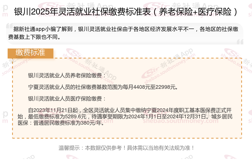 宁夏灵活就业人员的社保缴费基数范围为每月4408元至22998元。