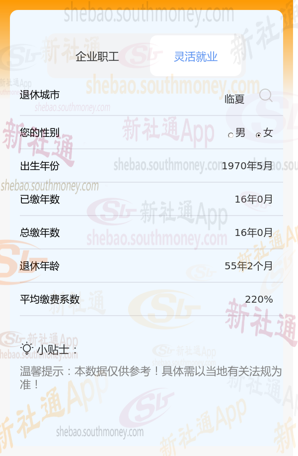 笔友王某退休城市在临夏,性别:女,出生年份:1970,总缴年数16年,缴费档次:220%