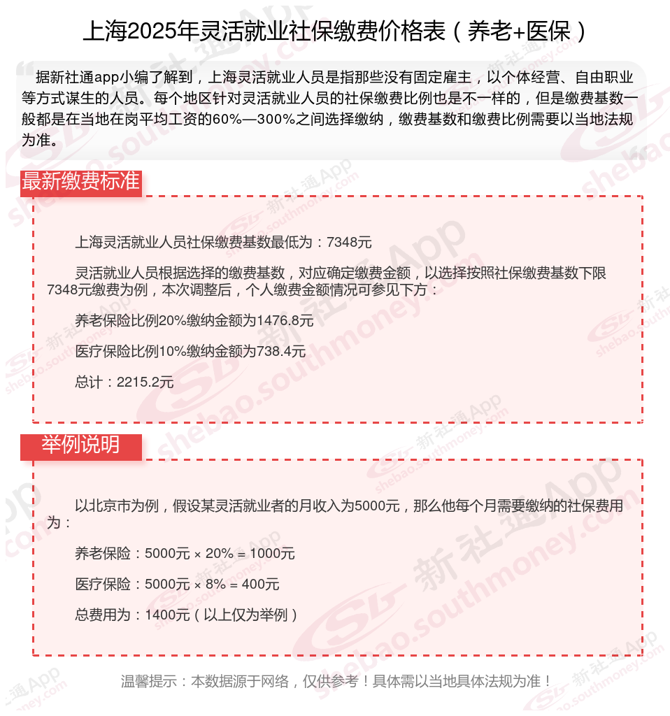 据新社通app数据显示,2024-2025年上海灵活就业人员养老保险的缴费标准: