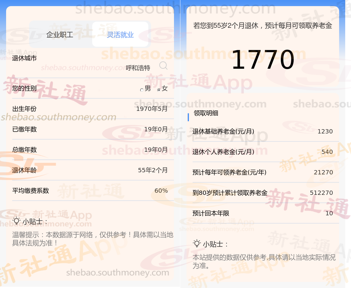 退休城市:呼和浩特,性别:女,出生年份:1970,总缴年数19年,缴费档次:60%,新社通app养老金计算器所得: