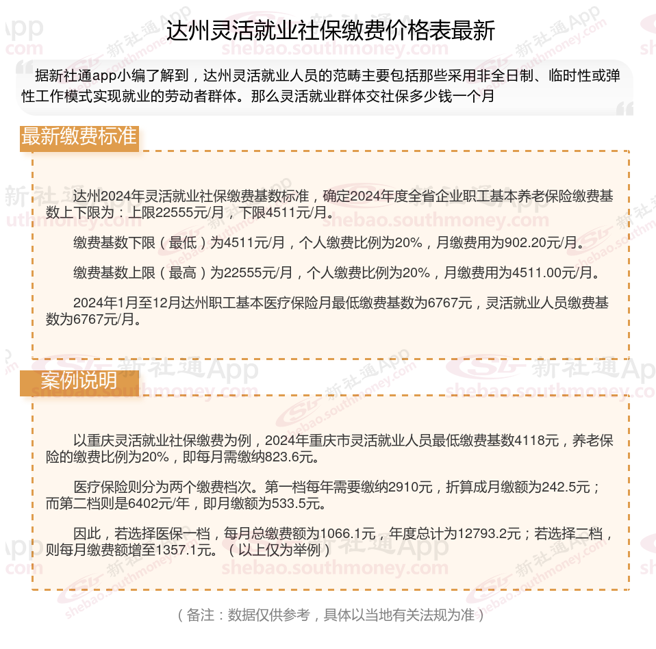 新社通app数据显示,达州灵活就业养老保险缴费基数2024-2025年最新标准如下: