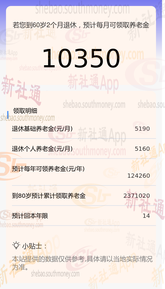 每月可领养老金总额:将基础养老金与个人养老金相加,每月可领取的养老金总额约为10350元(5190元+5160元)。