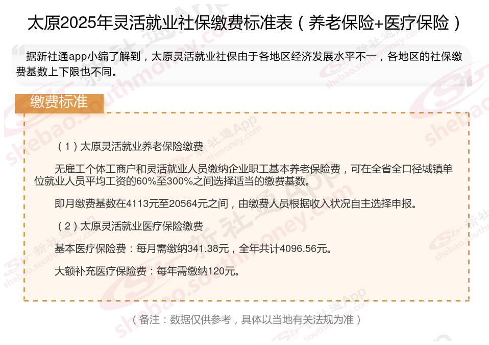 太原社保缴费多少钱?下表是2024-2025年太原社保费用明细参考,根据新社通app-社保缴费查询工具提供的最新数据如下: