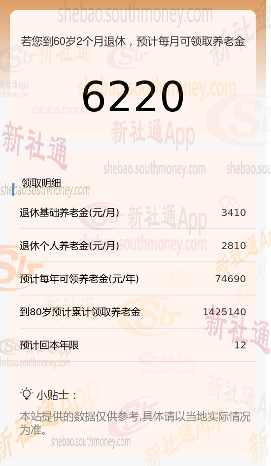 因此,他每月的总养老金金额为两者之和,即6220元。