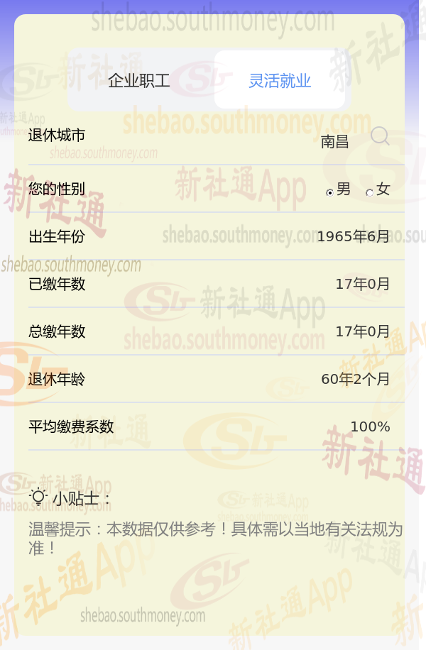 以南昌1965年男性希某为例,假设其按最低标准(缴费系数0.6)缴纳社保,新社通app养老金计算器预设工资增长率等参数为3%。在此情境下,其退休后能领取的养老金数额需通过计算器精确得出,但基于上述条件,预计数额会相对较低。为获准确估算,建议希某使用计算工具按要求输入个人信息进行计算,具体数额依个人情况及当地法规而定。