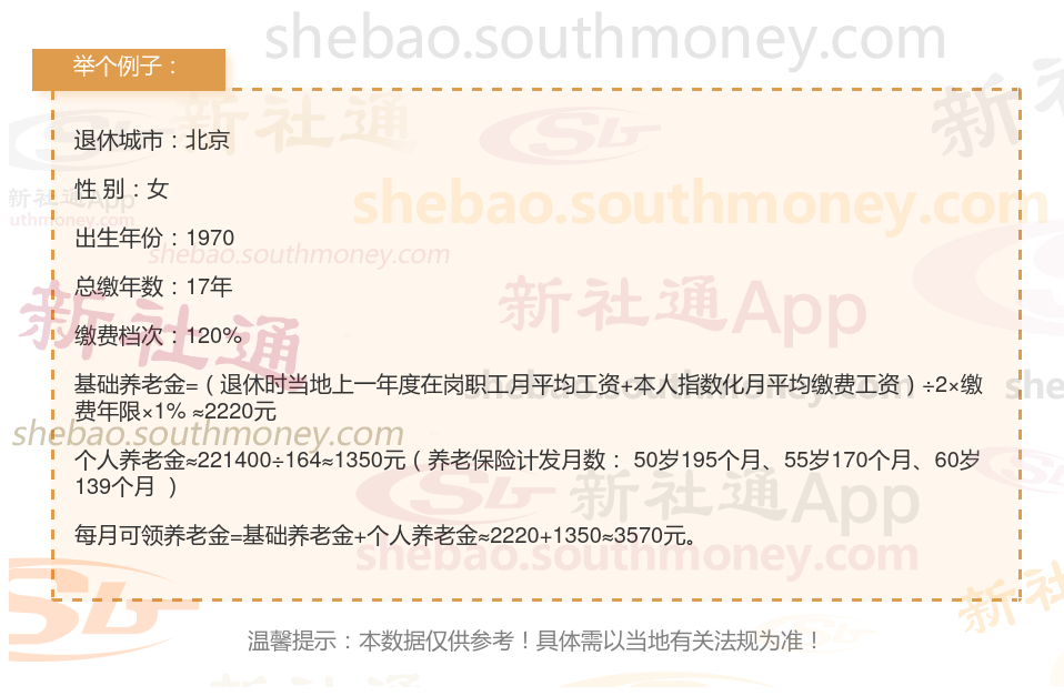 退休城市:北京,性别:女,出生年份:1970,总缴年数17年,缴费档次:120%,新社通app养老金计算器所得: