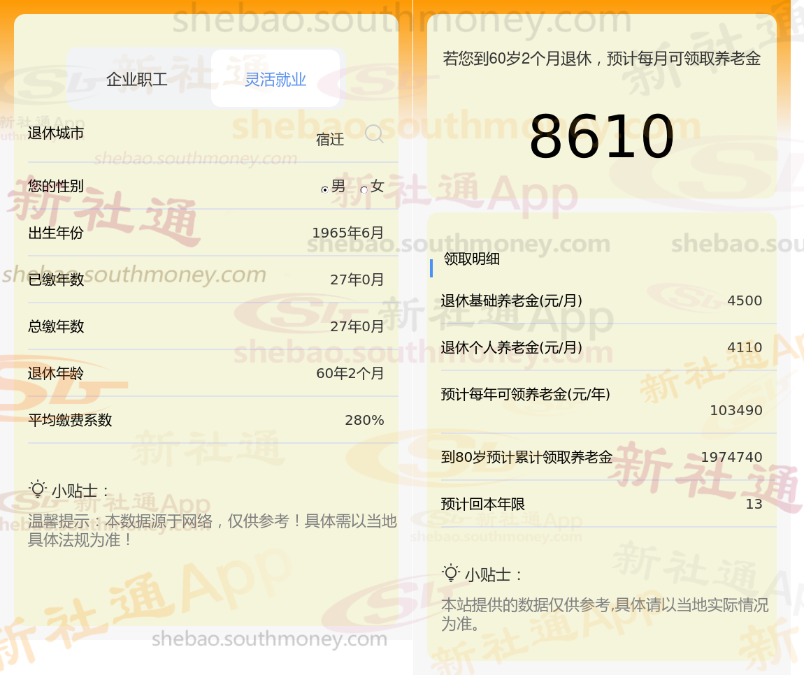 近期,有一位来自宿迁的已退休男性,灵活就业社保人员通过后台询问,即将步入退休了,累计工作年限为27年。每月按照280%档位缴纳。他想知道,基于这些信息,他退休工资一个月多少钱?并且是否能够达到8300元。