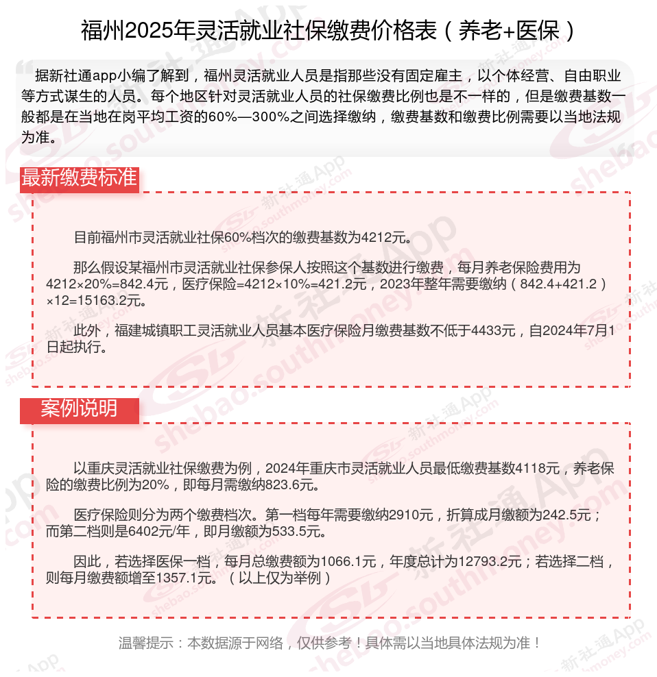 据新社通app数据显示,福州灵活就业养老缴费基数明细如下: