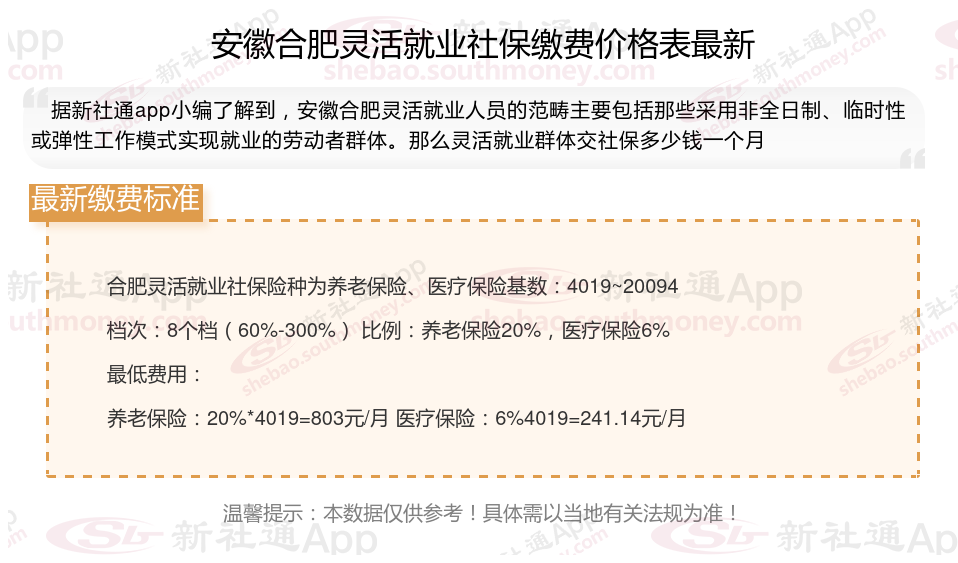 安徽合肥灵活就业者社保缴纳金额怎么计算?根据新社通app-社保缴费查询工具提供的最新数据如下: