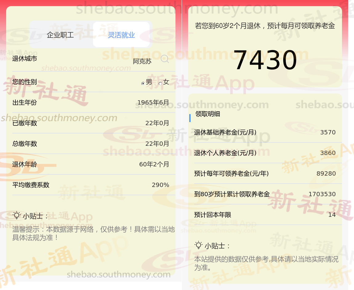 通过上面公式和新社丫丫根据新社通app-社保缴费查询工具提供的最新数据一起来了解下,新疆阿克苏退休养老金怎么算?
