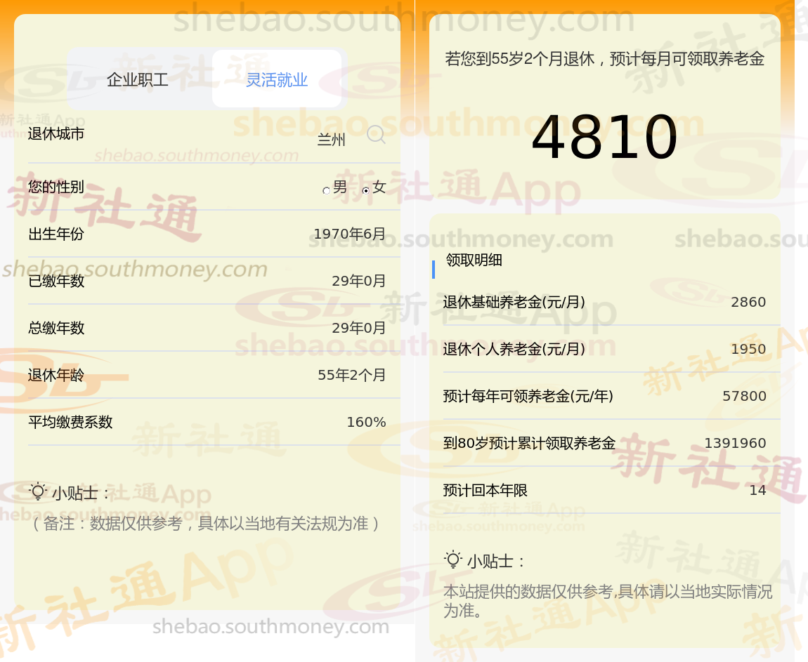 退休城市:兰州,性别:女,出生年份:1970,总缴年数29年,缴费档次:160%,新社通app养老金计算器所得: