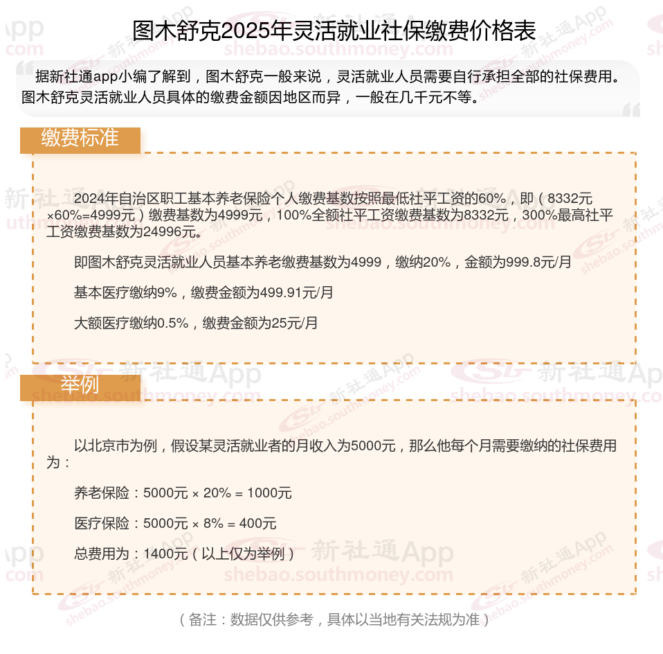 图木舒克社保缴费多少钱?下表是2024-2025年图木舒克社保费用明细参考,根据新社通app-社保缴费查询工具提供的最新数据如下: