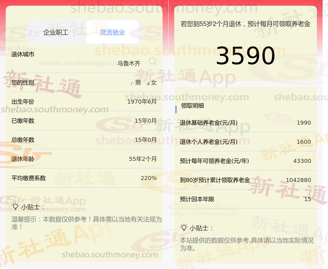 邻居张某退休城市在乌鲁木齐,性别:女,出生年份:1970,总缴年数15年,缴费档次:220%,新社通app养老金计算器所得: