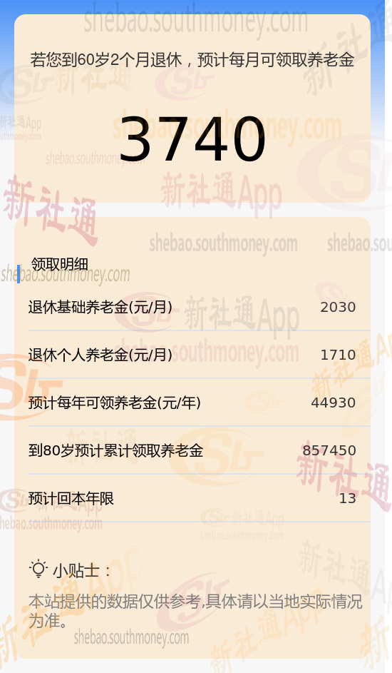 将基础养老金与个人养老金相加,我们就可以得出每月可领取的养老金总额。即2030元(基础养老金)加上1710元(个人养老金),总计约为3740元。这个数字为退休人员提供了一个相对稳定的月度收入来源。