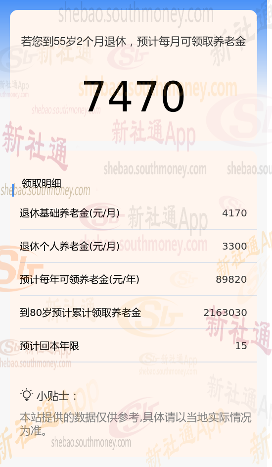 将基础养老金与个人养老金相加,我们就可以得出每月可领取的养老金总额。即4170元(基础养老金)加上3300元(个人养老金),总计约为7470元。这个数字为退休人员提供了一个相对稳定的月度收入来源。