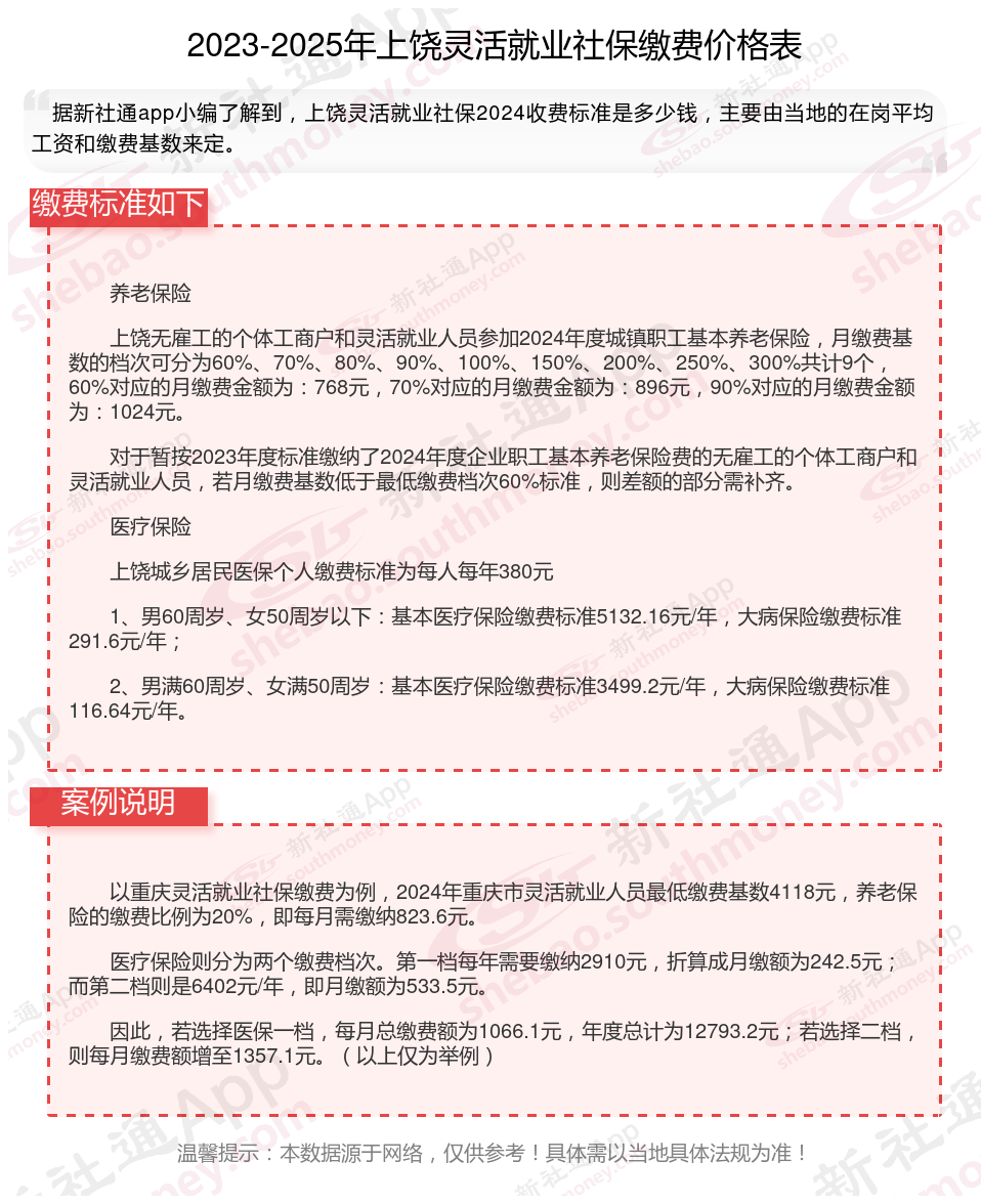 上饶社保缴费多少钱?下表是2024-2025年上饶社保费用明细参考,根据新社通app-社保缴费查询工具提供的最新数据如下: