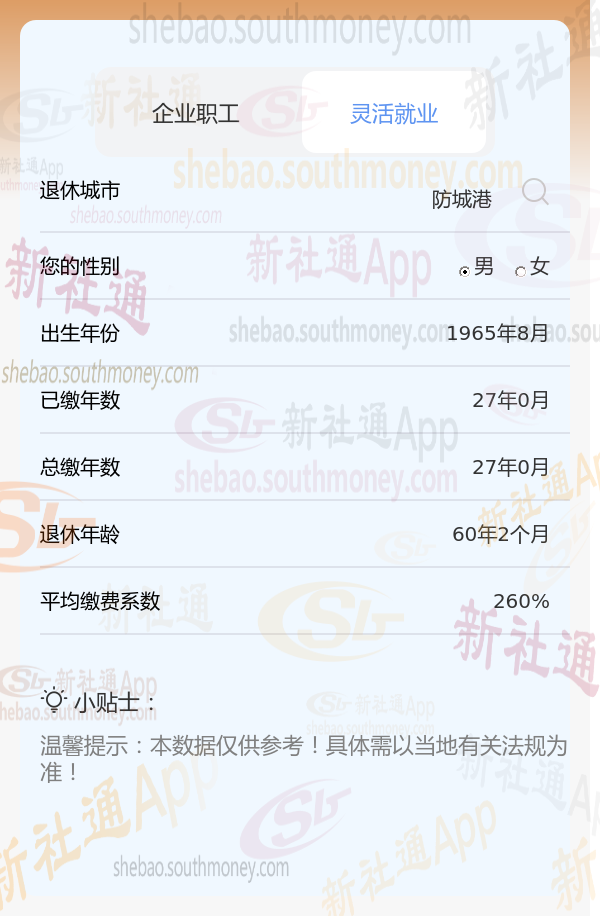 同事林某退休城市在广西防城港,性别:男,出生年份:1965为例,假设其按最低标准(缴费系数0.6)缴纳社保,新社通app养老金计算器预设工资增长率等参数为3%。在此情境下,其退休后能领取的养老金数额需通过计算器精确得出,但基于上述条件,预计数额会相对较低。为获准确估算,建议林某使用计算工具按要求输入个人信息进行计算,具体数额依个人情况及当地法规而定。