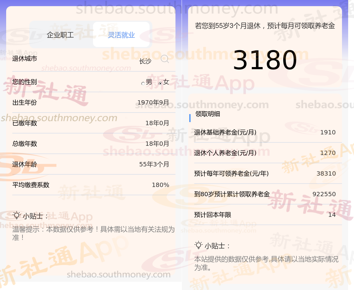 网友杨某退休城市在长沙,性别:女,出生年份:1970,总缴年数18年,缴费档次:180%,新社通app养老金计算器所得:
