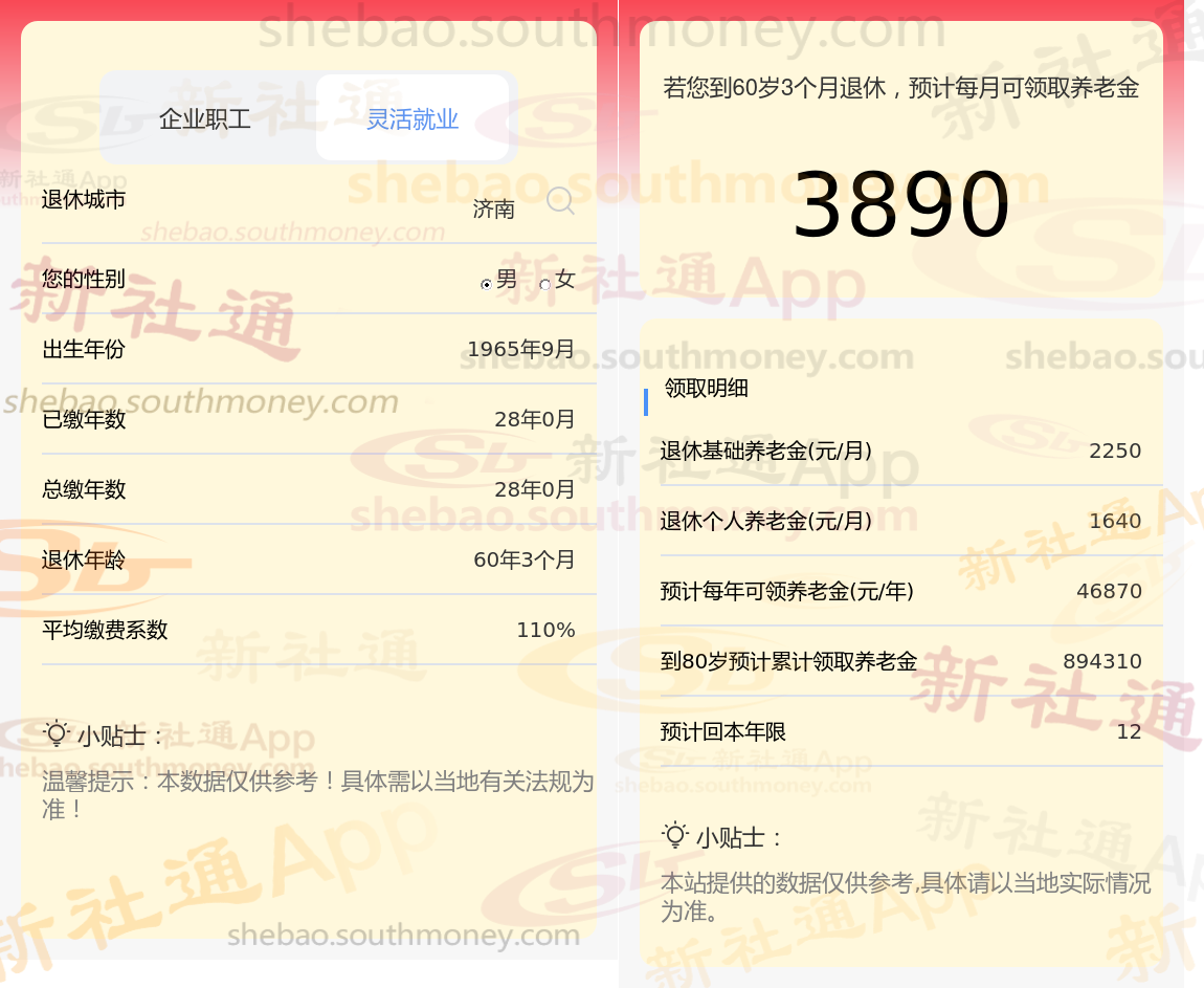 亲戚柯某退休城市在济南,性别:男,出生年份:1965,总缴年数28年,缴费档次:110%,新社通app养老金计算器所得: