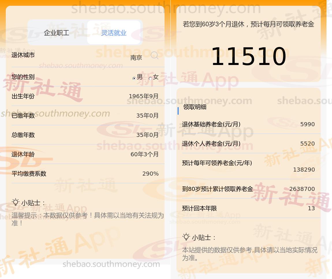 近期,有一位来自南京的已退休男性,灵活就业社保人员通过后台询问,即将步入退休了,累计工作年限为35年。每月按照290%档位缴纳。他想知道,基于这些信息,他退休金能拿多少?并且是否能够达到11100元。