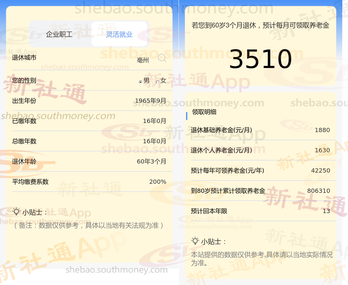 每月总共能领多少:把上面两个数加在一起,就是每个月你能领到的养老金总数啦,大概是3510元(即1880元基础养老金+1630元个人养老金)。