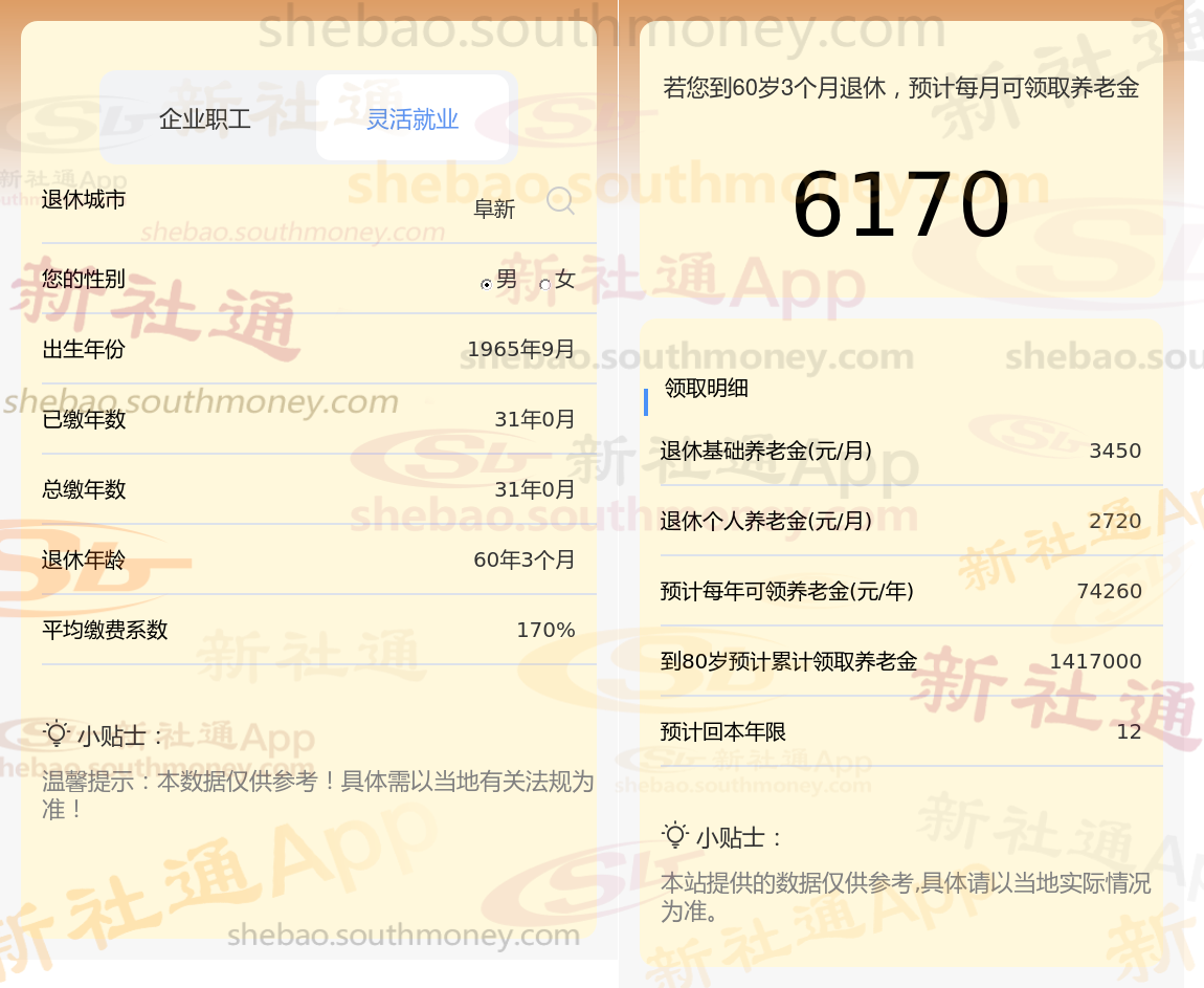 新社通app养老金计算器计算所得: