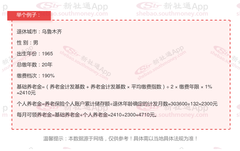 退休城市:乌鲁木齐,性别:男,出生年份:1965,总缴年数20年,缴费档次:190%
