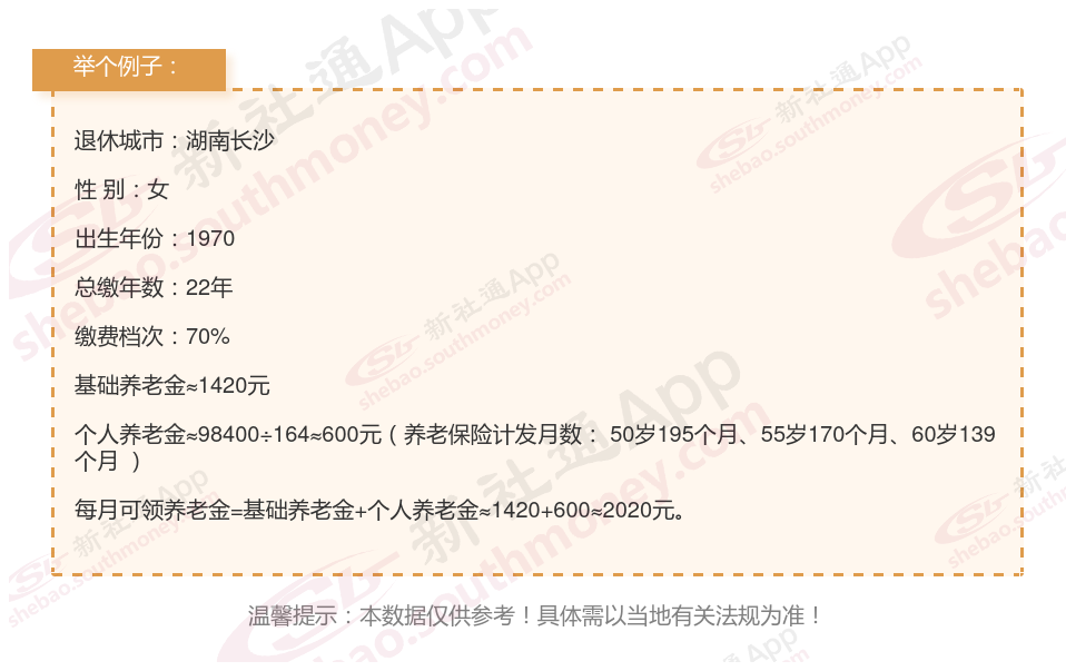 亲戚孔某退休城市在湖南长沙,性别:女,出生年份:1970,总缴年数22年,缴费档次:70%