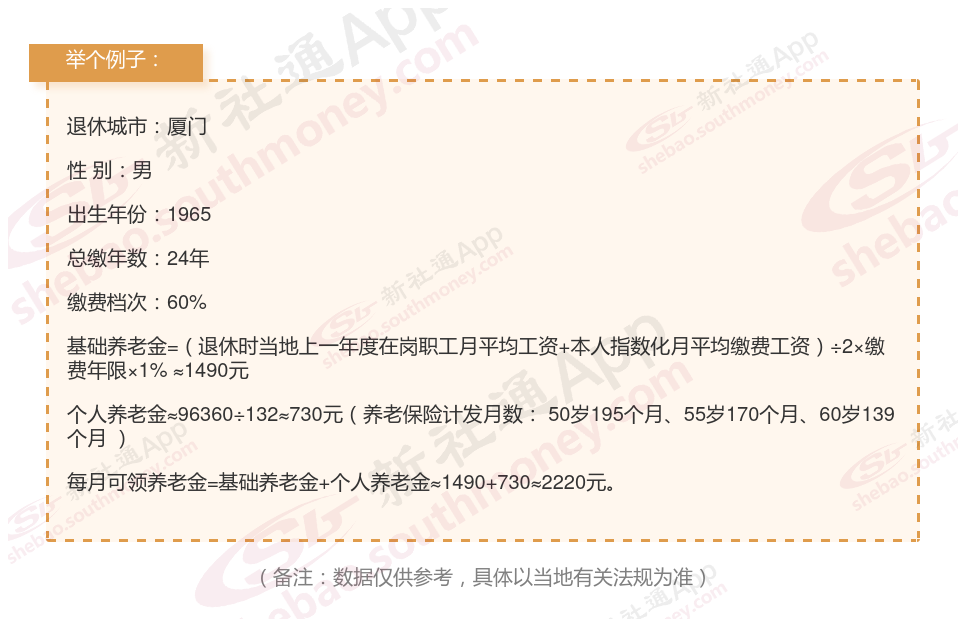 朋友孔某退休城市在厦门,性别:男,出生年份:1965,总缴年数24年,缴费档次:60%