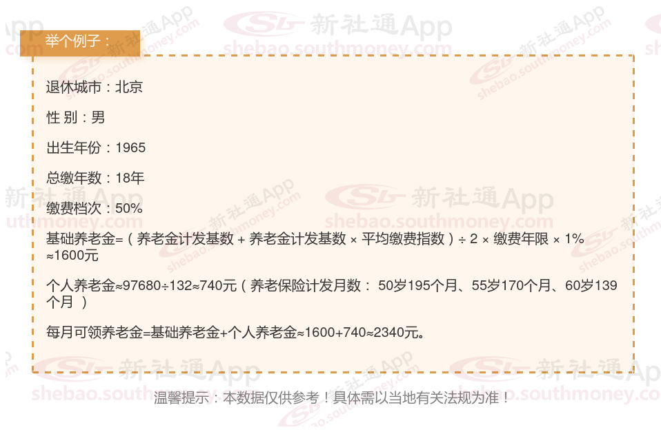 基本养老金计算公式为:(退休时上年度全市城镇单位就业人员月平均工资+本人指数化月平均缴费工资)÷2×缴费年限×1%。