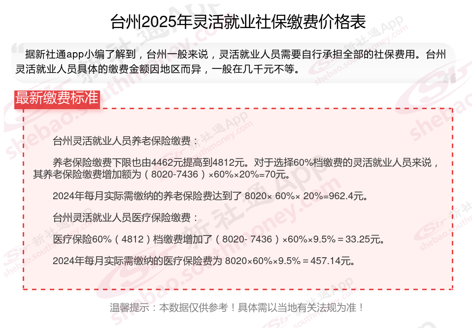 据新社通app数据显示,台州灵活就业养老保险最低缴费基数为:4462元;个人的缴费比例分别为:20%;