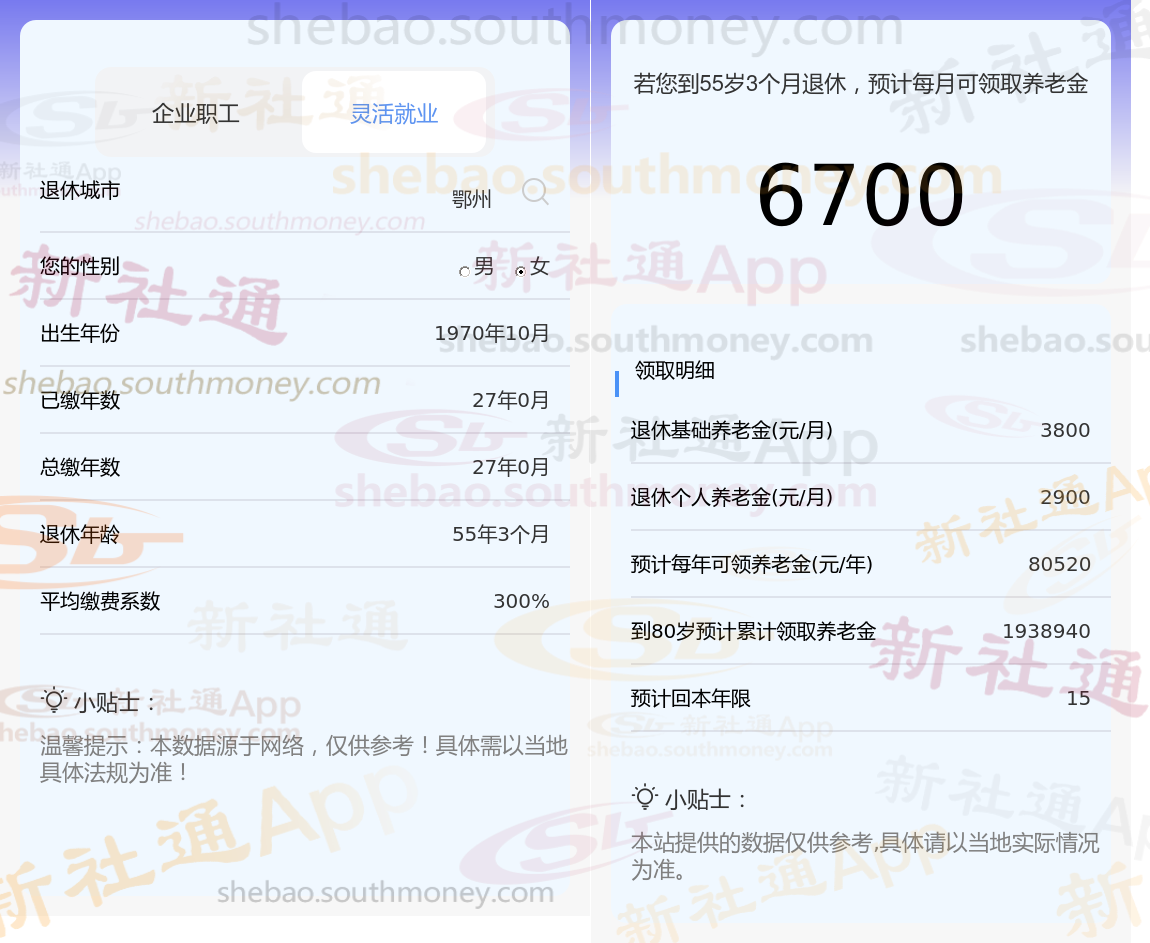 退休地点的不同,会导致养老金的计算基础存在差异。例如,像北京和上海这样的大城市,由于其经济发达,养老金的计算基数相对较高,因此在这类一线城市退休的人,往往能够享受到更高水平的养老金。接下来,让我以鄂州为例,为您进一步说明。接下来新社通-app小编带您一起看下例子: