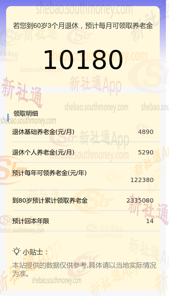 5、退休年龄:根据的退休年龄要求,男性预计退休年龄为63岁,女性预计退休年龄为55岁或58岁(具体根据当地法规而定)。这一数据通常由社保系统自动计算得出。