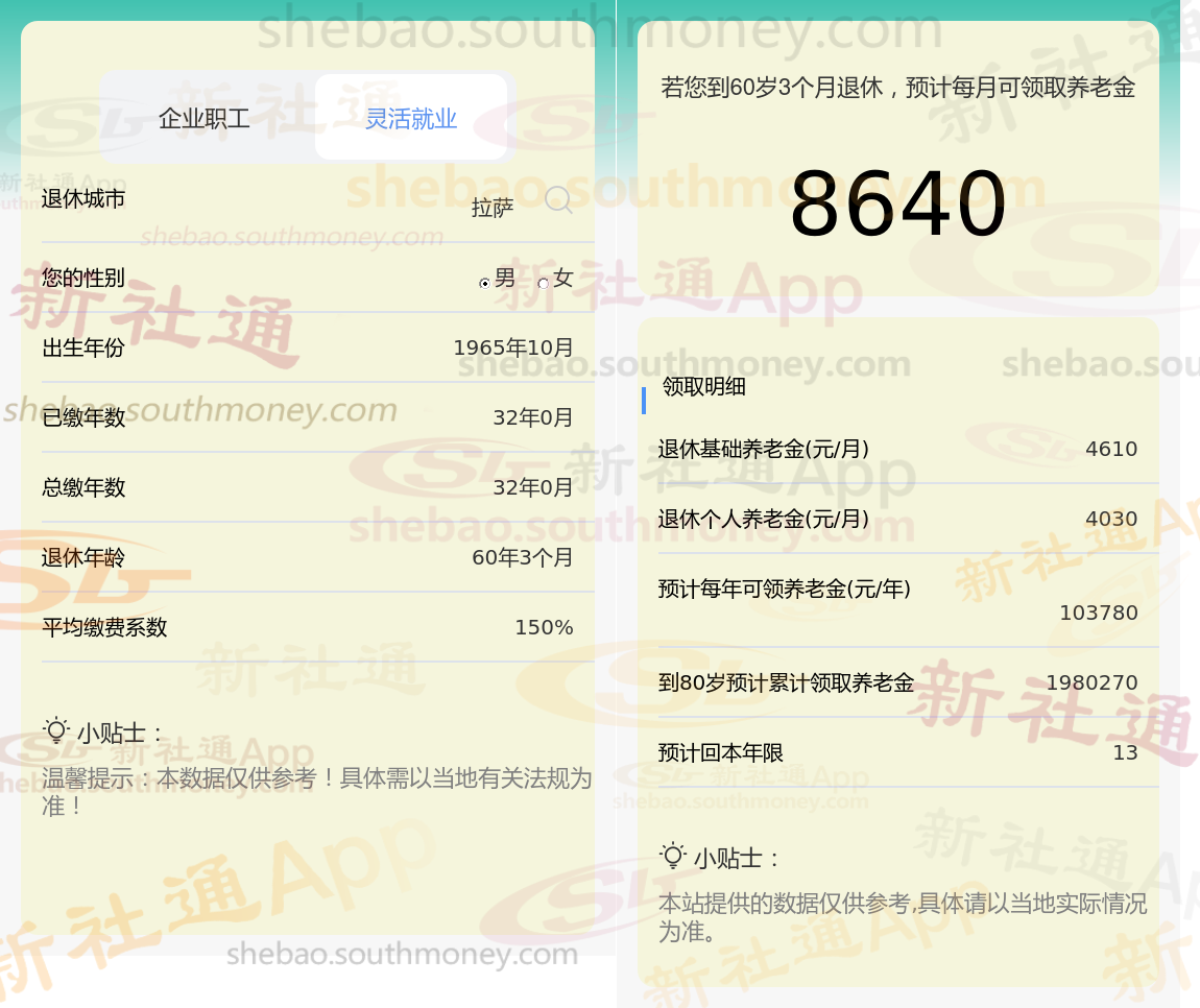 退休城市:拉萨,性别:男,出生年份:1965,总缴年数32年,缴费档次:150%,新社通app养老金计算器所得: