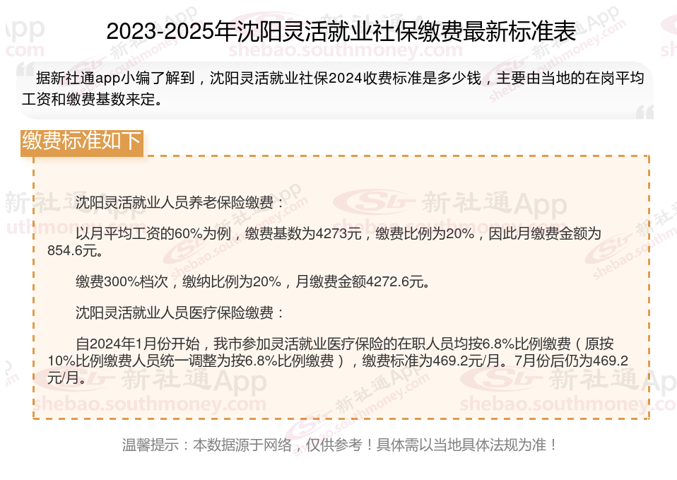 沈阳社保缴费多少钱?下表是2024-2025年沈阳社保费用明细参考,根据新社通app-社保缴费查询工具提供的最新数据如下: