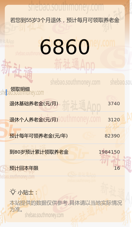 每月可领养老金总额:将基础养老金与个人养老金相加,每月可领取的养老金总额约为6860元(3740元+3120元)。