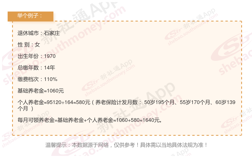 退休城市:石家庄,性别:女,出生年份:1970,总缴年数14年,缴费档次:110%,新社通app养老金计算器所得: