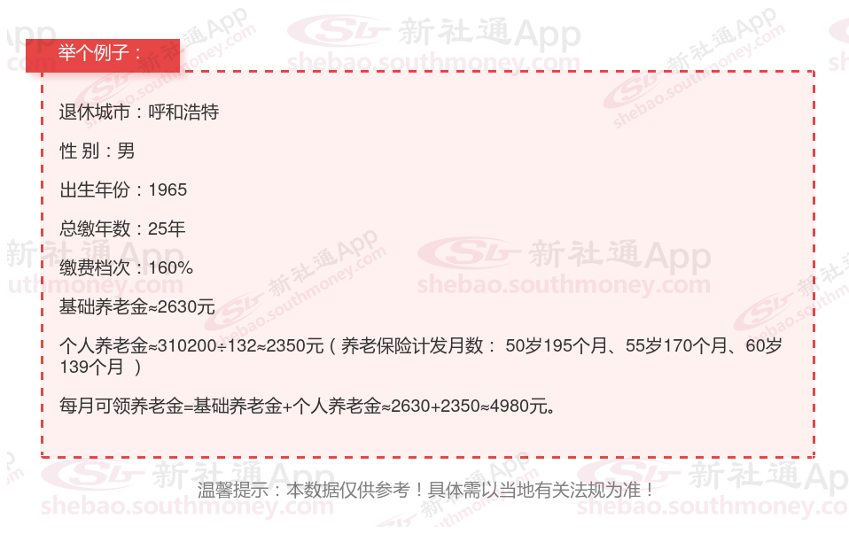 亲戚沈某退休城市在呼和浩特,性别:男,出生年份:1965,总缴年数25年,缴费档次:160%,新社通app养老金计算器所得: