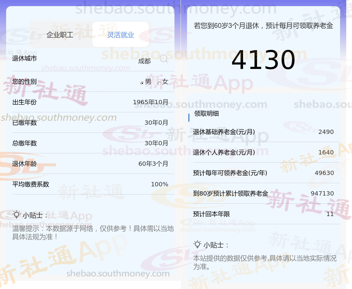退休城市:成都,性别:男,出生年份:1965,总缴年数30年,缴费档次:100%,新社通app养老金计算器所得: